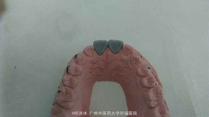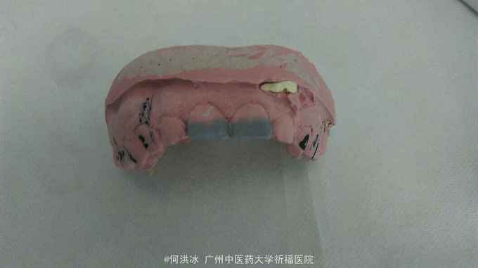 诊断:牙折。 治疗方案:因牙外伤过了三天,露髓这么久,转治疗医生行11,21的根管治疗。后直接树脂分层充填修复。 1, 11,21根管治疗,由牙体牙髓医生完成。观察半个月,牙周牙龈恢复。 2, 诊断蜡型mockup制作。由技工完成。 3, 硅橡胶导板制作。 4, 比色。 5, 基牙及粘结面处理,边缘抛光。 6, 硅橡胶阴模上树脂舌侧翼板制作,3M 350树脂。用充填器,结合尖毛笔压薄。初步光照。 7, 就位翼板,再光照固定。 8,分层树脂充填,切端以树脂球雕出发育沟,最表层3M 350。 9,精细修型,抛光。由粗到细,慢速,一个方向。 10,充填体边缘白线,一周后再流体树脂处理。