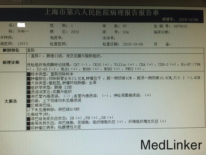 入院诊断:急性肠梗阻、直肠恶性肿瘤。 治疗:患者入院后急诊行“剖腹探查+直肠癌切除+远端封闭+乙状结肠造口术(Hartmann术)“。术中探查发现腹腔中量腹水,吸尽腹腔积液后探查及腹膜返折上5cm直肠处可及一肿块,质硬,占肠腔一圈,活动尚可,已浸润至直肠浆膜层。肿块近端结肠及小肠扩张伴肠壁明显水肿增厚,肠系膜、肝脏、胃、腹壁等无转移性结节。行直肠肿瘤切除+乙结肠造瘘术。 手术经过顺利,术后标本送病检,病人安返病房。术后予对症支持治疗,术后复查腹部CT提示:直肠术后,左下腹造瘘后,腹腔引流中,肠腔少量积气。前列腺密度不均匀,局部见钙化,未见明显增大,两侧精囊未见明显异常,膀胱充盈可,盆腔未见明显肿大淋巴结,盆腔未见明显积液。1.直肠术后,请结合临床随访。2.前列腺钙化。术后造瘘口通畅,恢复进食后顺利出院,术后患者的病理分期为:T3N1CM0 IIIB期。术后诊断为:直肠癌伴肠梗阻(T3N1CM0 IIIB期)。 PS:术后病理报告为—直肠 标本类型:直肠切除标本 肿瘤部位:切除肠管全长13.5CM,肿瘤位于 :距一侧切缘1CM ,距另一侧切缘10.5CM,大小 2 ×1.8CM 大体类型:隆起型,肿瘤环绕肠壁:全周 组织学类型:腺癌 II级 浸润深度达:浆膜外组织 淋巴管内癌浸润:(-),血管内癌浸润:(-),神经周围癌浸润:(+) 切缘:上下切缘均未见癌浸润 区域淋巴结: 以下未见癌转移:淋巴结0/8枚 见癌结节2枚。 淋巴结免疫反应状态:SH(+),PH(+),GH(+) 癌周间质反应:淋巴细胞,浆细胞,组织细胞反应(+),纤维组织增生反应(+) 非肿瘤区病变:粘膜慢性炎症(直肠):腺癌II级,侵及浆膜外脂肪组织。送检组织免疫酶标记结果:CK7(-),CK20(+),Villin(+),CEA(+),CDX-2(+),Ki-67(70%+),D2-40(-),MLH1(+),MSH6(+),MSH2(+),PMS2(+)。