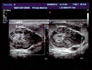 睾丸表皮样囊肿临床少见,是一种睾丸的良性肿瘤,恶变率较低,仅占睾丸肿瘤的1%。本病常见于20—40岁的男性,以右侧睾丸发病为主,常以阴囊内肿块为首发症状。彩色多普勒是诊断睾丸肿瘤的主要手段之一。在诊断睾丸表皮样囊肿,其准确率高达90%。典型表现为肿物周边界限清楚,有强回声壁,肿物内大部分为低回声,部分中心为强回声,呈所谓的“靶环样”图像,内部无或仅有少量血流信号。目前睾丸表皮样囊肿的诊断依据病理学结果,不推荐睾丸穿刺活检,如为睾丸结核或恶性肿瘤,穿刺后会增加播散及转移的风险。睾丸表皮样囊肿是少见的睾丸良性肿瘤,超声对本病的诊断有较大意义,术后病理结果明确诊断。及早进行保留患侧睾丸的肿瘤剜除术,随访效果满意。