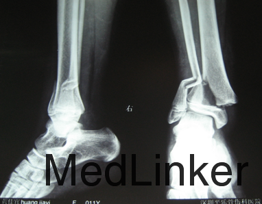 患者12岁。主诉:左踝关节疼痛活动受限8小时。现病史:8小时前摔伤,伤后出现左踝关节疼痛活动受限,急诊送至当地医院,行左踝关节正侧位DR,提示为:左胫骨远端骨折,为求进一步治疗来我院就诊,发病以来患者神志清楚,无发热,无恶心呕吐,近期体重未见明显变化。