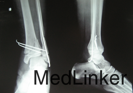 诊断:左胫骨远端骨折 治疗:消肿止疼治疗,择期行骨折闭合复位克氏针内固定术