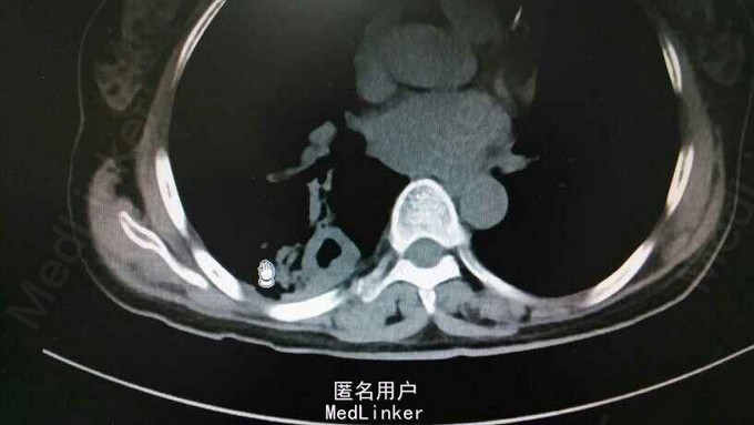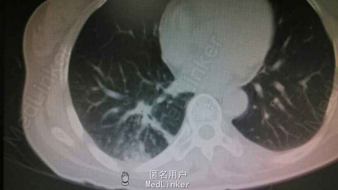 生命征平稳,双上臂多发皮疹,心肺腹未及异常。胸部CT示右肺上叶后段及右肺下叶背段病灶,结核可能。