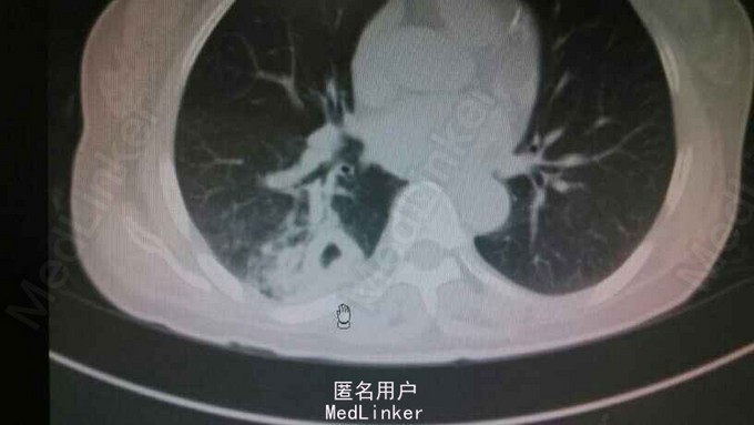 58岁女性,发现右下肺阴影10天入院。10天前因恶心呕吐入院,胸片示右下肺致密影。无发热,无咳嗽咳痰,无胸闷胸痛,无气促等不适。既往糖尿病史。