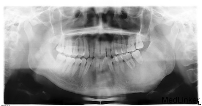 颌面部左右不对称,左下颌区较右侧肥大,开口型正常,开口度4.0cm,双侧关节无明显压痛、弹响,双侧髁突动度左右基本对称。左下颌骨约35至磨牙后区颌骨肿大,前庭沟变浅,同时舌侧可及肿大,质地硬,黏膜无破溃流脓,牙齿无明显松动。