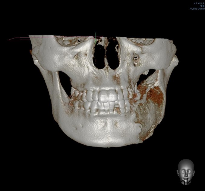 发现左下颌骨局部肿大6年,青年女患者,慢性病程。患者于6年前无明显诱因发现左下颌骨局部肿大,逐渐加重,无明显疼痛、口角麻木等不适。今为进一步治疗来我院就诊,门诊以"左下颌骨骨纤维异常增殖症"收入院