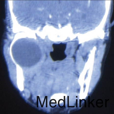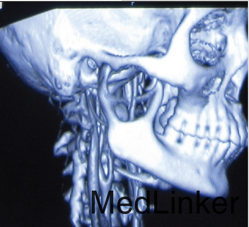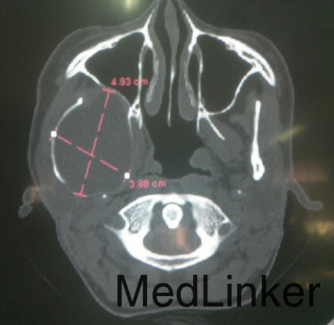 检查发现面部对称,开口度正常,右侧颞下颌关节区可扪及柔软肿块,右侧颞下颌关节运动较左侧减弱,颈部淋巴结无明显肿大。 影像学检查发现右侧颞下颌关节可见一完整4.9*3.8cm大小溶骨性囊性病变,内含积液。