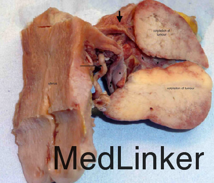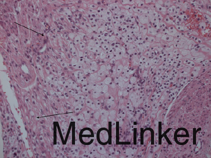 初步诊断为非退化性肌瘤 建议患者行经腹全子宫切除术+双侧附件切除术 肉眼观,子宫轻度增大9*5*4cm,附件正常,子宫表面有一分叶状褐色肿瘤4*3*3cm 镜下观,肿瘤由上皮细胞组成,嗜酸性细胞质,不可见其核异型和核分裂活动 肿瘤细胞之间可见单个或成簇的血管,无血管内肿瘤 肿瘤有子宫内成分和子宫肌层成分 免疫组化提示desmin, vimentin and CD10(+),caldesmon和smooth muscle actin也是强阳性