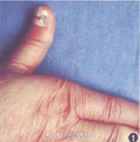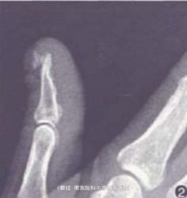 本病的x线特征为末节指指骨与远端相连的骨性高密度影,由于本病早期临床症状不典型,多表现为甲下脓肿、甲板缺失等。易误诊为嵌甲、甲下寻常疣、甲下感染或甲周纤维瘤等而延误治疗。引自《国际皮肤性病学杂志》,doi:10.3760/cma.j.issn.1673-4173.2009.01.008