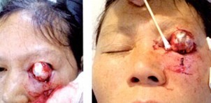主诉:左眼被双轮车车把击伤后眼球突出3 h。 病史:患者女,45岁。因左眼被双轮车车把击伤后眼球突出3 h于2014年5月7日人院。