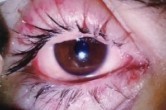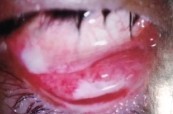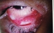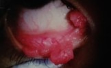 患者男 22岁,因右眼结膜肿物术后复发5月 患者1年前发现右眼结膜肿物,行右眼结膜肿物切除术,术后无不适。5月前自觉右眼眼胀,眼红,遂我院就诊,诊断结膜肿物,建议手术,并明确病理。