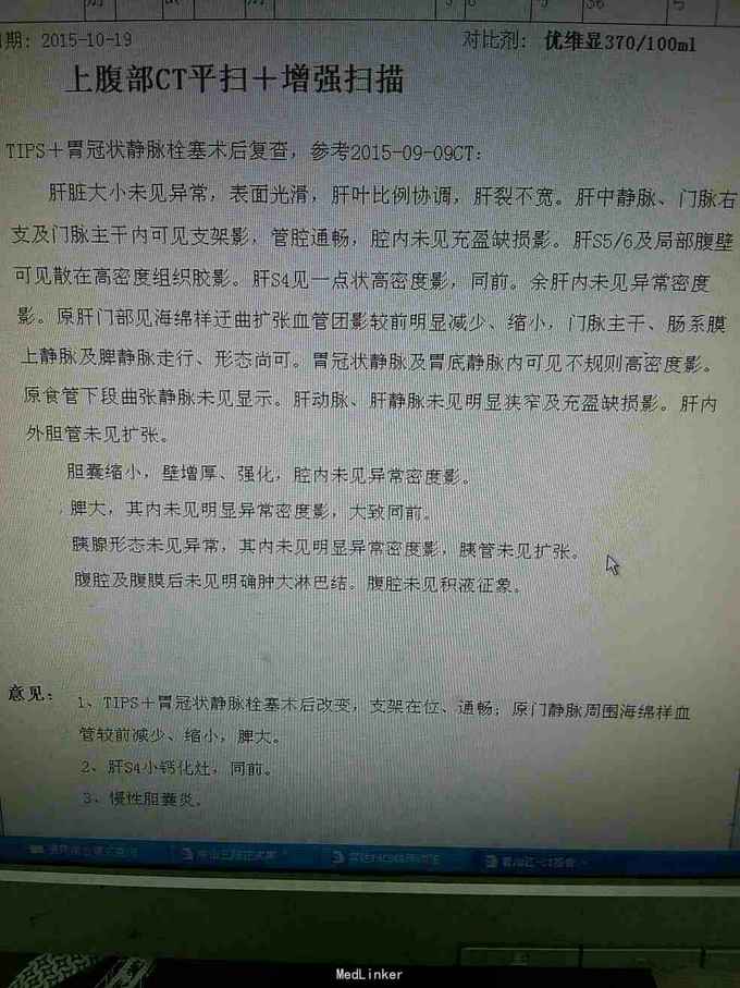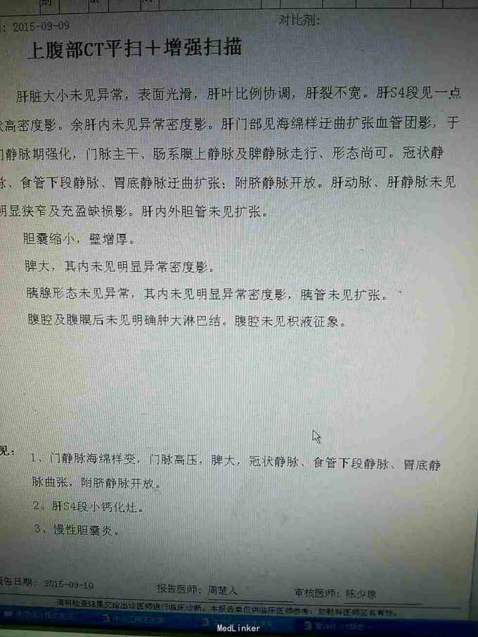 随访:患者1月后依约返院随访,复查腹部CT提示海绵样较前吸收,附图如下: 讨论:门静脉海绵样变是常见的肝门部门静脉血管病变,约占门静脉高压疾病的3.5%。该病变导致的门静脉血流阻塞,可引起食道胃底静脉曲张、巨脾、白细胞及血小板降低等严重并发症。Ueno依据彩色多普勒显像表现将CTPV分为3型:Ⅰ型表现为门静脉正常结构不清,仅显示门静脉区呈蜂窝状结构,原发性CTPV均属此型;Ⅱ型表现为门静脉主干可以显示,但内部被栓塞物填塞,在其周围可见侧支静脉;Ⅲ型表现为门静脉附近存在肿块回声,门静脉受压致侧支静脉形成。Ⅱ、Ⅲ型属继发性CTPV表现。