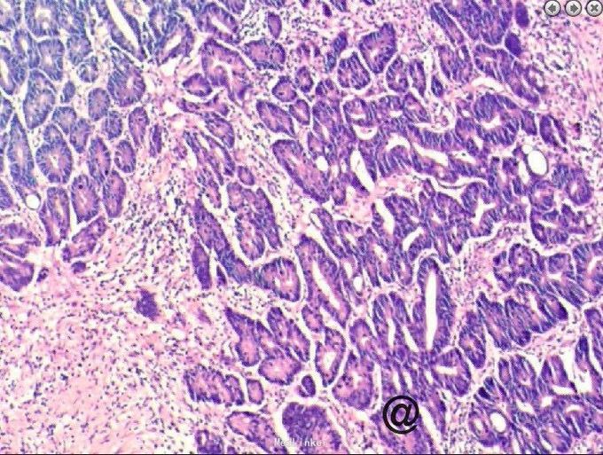 阑尾癌比较少见,以类癌多见,约占90%以上,腺癌罕见。类癌是胃肠道恶性肿瘤的一种,瘤体小,生长也慢,症状常不明显,亦可发生转移。类癌并不多见。如果类癌瘤体分泌释放肽胺类激素,患者就会出现腹痛、腹泻、哮喘、肝肿大等症状,医学上称为类癌综合征。阑尾炎很少发生此征。类癌各个年龄均可发病,平均发病年龄为40岁。阑尾类癌的恶性程度低,瘤体小,直径多在2厘米以下,且极少发生转移。阑尾类癌大多生长在距阑尾顶端1/3处,故不易堵塞阑尾管腔,很少引发阑尾炎。如果类癌生长在阑尾中1/3处,则多因堵塞管腔而发生阑尾炎。手术中,由于瘤体小,易不发现或误认为粪石,病理检查后方能得出正确诊断。阑尾类癌还可有阑尾穿孔表现,一般手术后才发现是阑尾类癌穿孔。本例发现腺癌,中分化程度,经切除后患者恢复良好,查国内文献偶尔有粘液性阑尾癌患者报道。本例手术前曾行肠镜检查观察阑尾内口无明显异常,分析考虑患者病变靠近阑尾顶端可能。所切除大体标本阑尾外膜尚完整光滑,咨询病例科医生诉患者阑尾肌肉组织层含有很多纤维增生成分。国外文献有报告甚少,多以类癌报道为主,近期看见一篇阑尾印戒细胞癌的case report!(Primary signet ring cell carcinoma of the appendix: A rare case report. World J Clin Cases 2015年 3卷 6期 538-41页 Primary adenocarcinoma of the appendix is a rare malignancythat constitutes < 0.5% of all gastrointestinalneoplasms. Moreover, primary signet ring cell carcinomaof the appendix is an exceedingly rare entity. In the present report, we describe a rare case of primary signet ring cell carcinoma of the appendix with ovarian metastasesand unresectable peritoneal dissemination occurring in a 45-year-old female patient. She was clinically misdiagnosed as torsion of ovarian cyst. She underwent appendicectomy and unilateral salpingo-oophorectomy.Histopathology revealed signet ring cell carcinoma and a right hemicolectomy was done. She then received palliative systemic chemotherapy with 12 cycles of oxaliplatin, 5-fluorouracil, and leucovorin (FOLFOX-4). The patient is doing well till today on follow up without progression of disease 10 mo after beginning chemotherapy. )