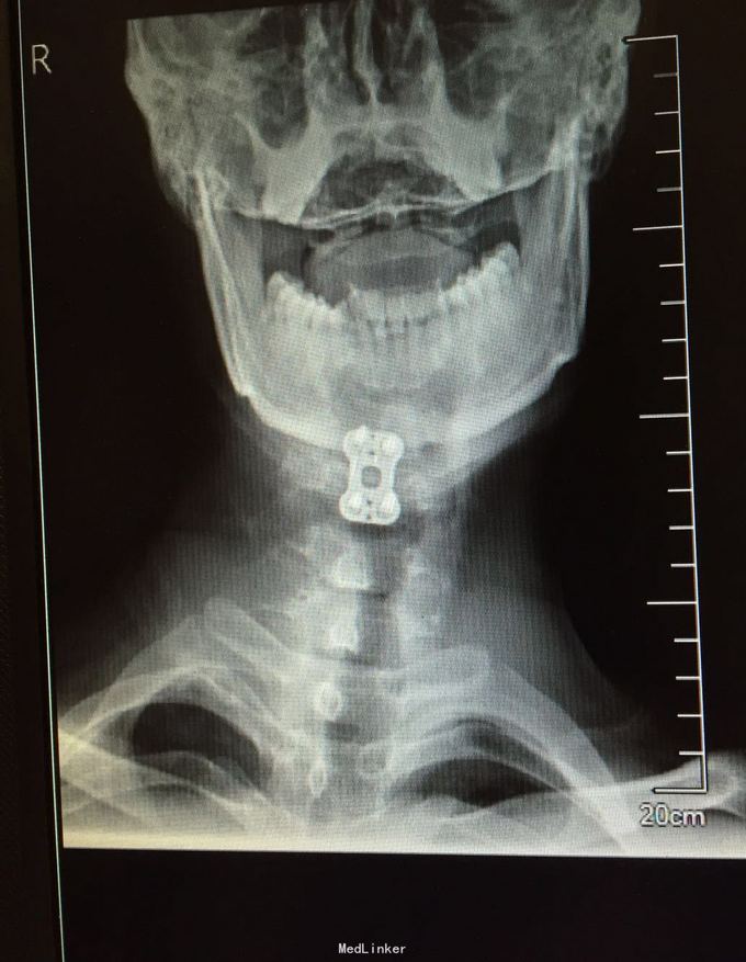 专科检查:颈椎生理弯曲变直颈椎各棘突及椎旁压痛,向右前臂放射,颈椎活动度,前屈60度,后伸20度,左屈40度,右屈40度,左侧旋转45度,右侧旋转45度,右上肢前臂感觉减低,运动差,双侧HOFFMAN症阳性。辅助检查:颈椎正侧位颈部4椎体向前滑脱。