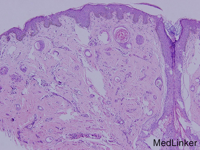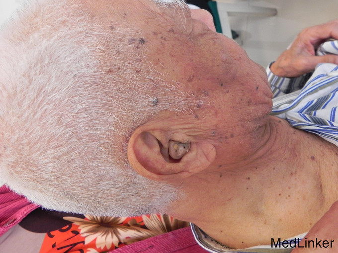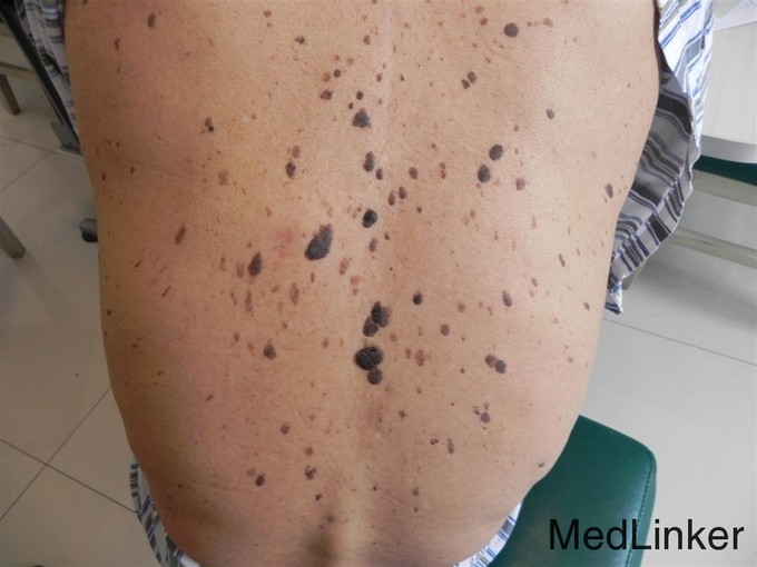 患者男,84岁,面背部黑褐色丘疹十余年,丘疹明显增多,伴显著瘙痒。既往史:1994年曾诊断“肺结核”,“高血压”病史10年,2000年诊断“乙状结肠癌”,行“乙状结肠癌根治术”,术后未行化疗。2004年复查肠镜发现“结肠息肉”,并行“结肠息肉切除术”,2007年肠镜再次发现升结肠小息肉,切除并行活检,病理示:(横结肠)管状腺瘤伴腺上皮轻——中度不典型增生。2009年、2011年复查肠镜再次出现小息肉,病理为:炎性息肉。