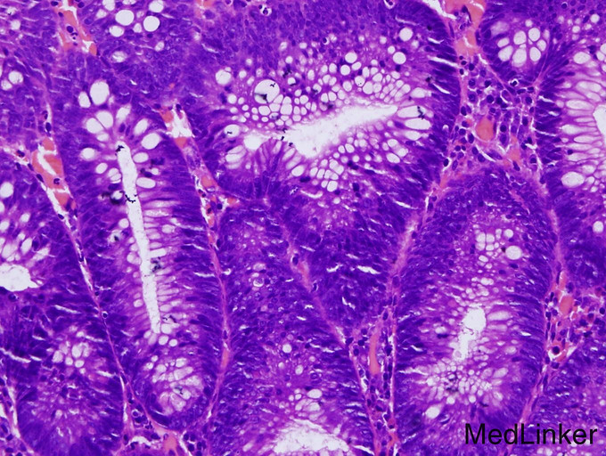 Leser-Trelat症首先由Edmund Leser和Ulysse Lrelat描述,1900年Hollander首次强调Leser-Trelat症与内脏肿瘤的关系。本症可单独发生,亦可同时与肿瘤并存,故学者们将此种皮肤损害称为内脏肿瘤的标志,故长期以来,本病一直被认为是一种皮肤副肿瘤性综合征。临床上,Leser-Trelat症是指突然出现多发性脂溢性角化或原有的脂溢性角化损害突然增大、数目增多,就每个损害而言,Leser-Trelat症的脂溢性角化与一般的脂溢性角化相同,分布也相似,多数损害位于背部和胸部,其次为四肢、面、腹和腋部,但也可泛发,通常上肢多下肢,可伴有不同程度的瘙痒。 Leser-Trelat症多伴发腺癌,主要发生在食管和胃,也有合并白血症或蕈样肉芽肿的报道。本例患者依据典型的脂溢性角病皮损、结肠组织病理学变化可确诊。