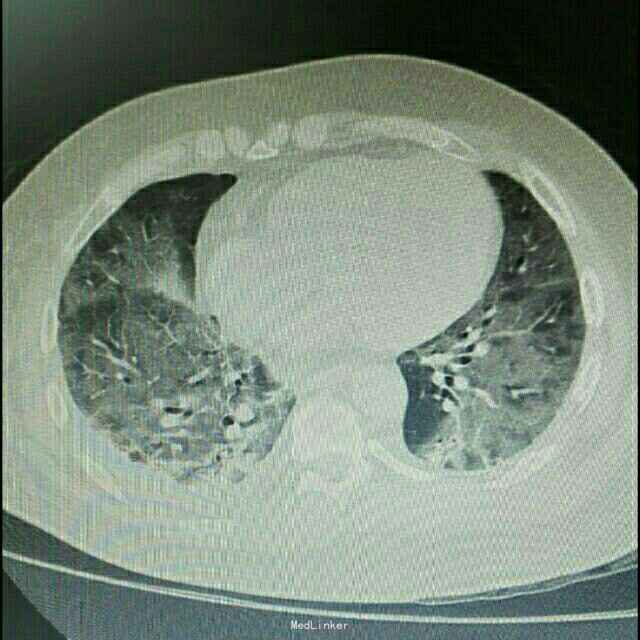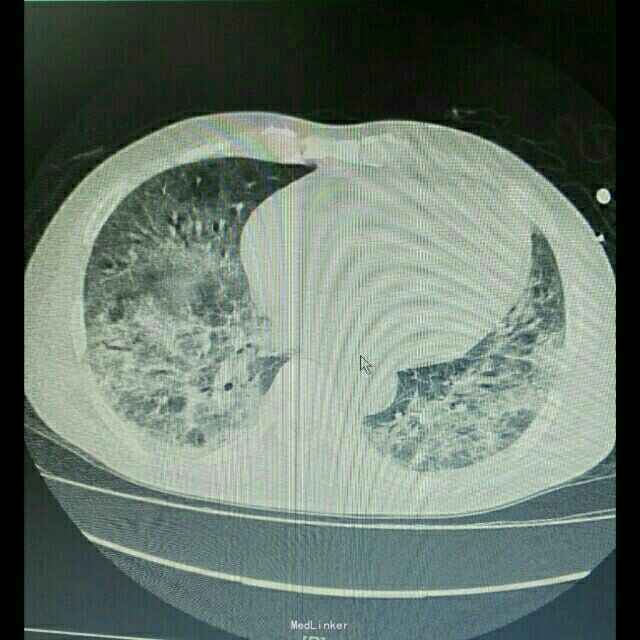 辅助检查:患者入院后症状进行性加重,入院2日后出现胸闷、气促,动脉血气分析提示氧分压为59mmHg,胸部CT提示双肺严重弥漫性炎症。
