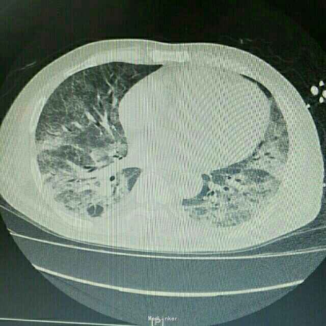 诊断:肺部感染;异体肾移植状态 治疗:患者入院后积极抗感染治疗,检查胸部CT和血气分析后给予吸氧等对症治疗,抗感染方案为泰能+伏立康唑+科赛斯+更昔洛韦,并停用所有口服免疫抑制剂,改为甲强龙40mgQd静脉滴注,患者治疗后肺部感染无明显好转,2日后转入ICU进一步治疗。
