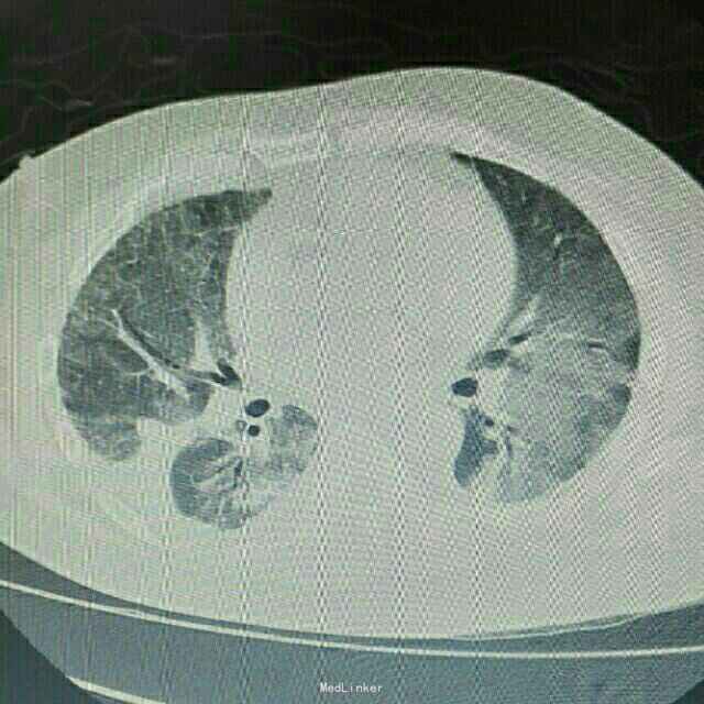 主诉:肾移植术后2月,发热、咳嗽5天 病史:患者男,45岁,因尿毒症于2月前在外院行异体肾移植术,手术过程顺利,术后恢复良好,移植肾功能稳定,服用FK506+MMF+Pred免疫抑制维持治疗。患者术后未规律门诊随诊,有情况变化时常电话联系行手术的医院,在术后免疫抑制剂服用剂量较大,为MMF1gBid+FK506 3.5mgBid+Pred25mgQd,其中FK506平时维持的浓度约10ng/ml。5天前开始出现发烧,最高体温38.8℃,自服“降温药”后体温可下降,伴咳嗽,无胸闷气促,无诉其他不适。