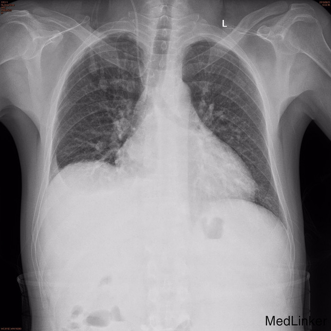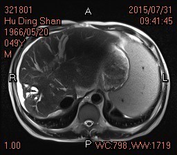 查体:全身皮肤有黄染,见肝掌及蜘蛛痣,腹肌软,腹部可见陈旧性手术疤痕,移动性浊音阴性,肠鸣音正常。 辅查: 腹部MRI:1.肝硬化,脾大,少量腹水,食道下段、胃底及脾门周围静脉曲张。 2.肝内胆管、左肝管扩张,门脉淋巴水肿;腹膜后、心膈角区多发肿大淋巴结,请结合临床。 3.胆囊术后缺如。 4.胰腺体尾部未见显示。