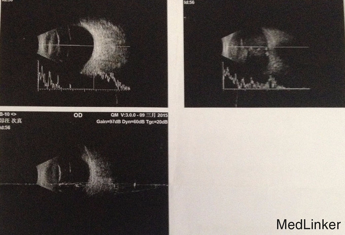 内皮细胞检查:OD 2411.2’mm2 OS 1255.5‘mm2。B超检查示:左眼玻璃体混浊合并视网膜脱离,右眼玻璃体混浊。