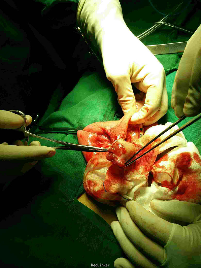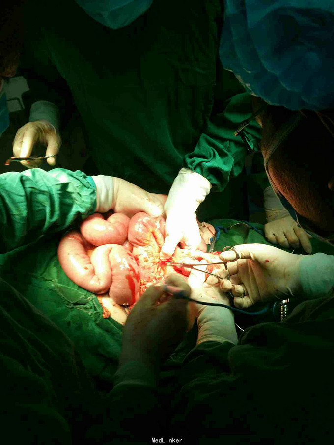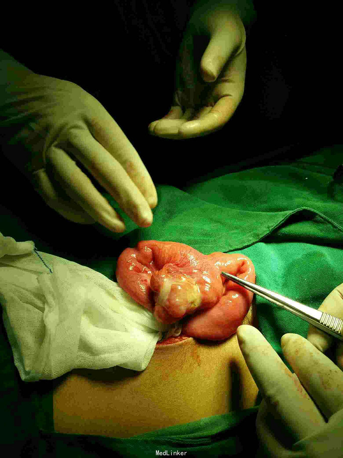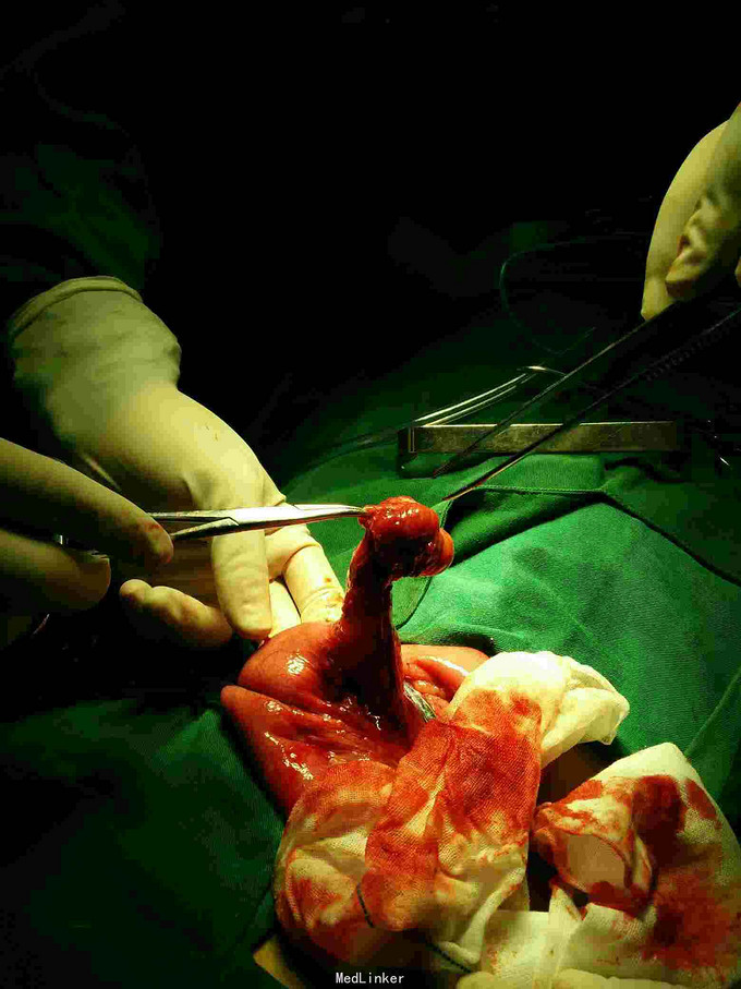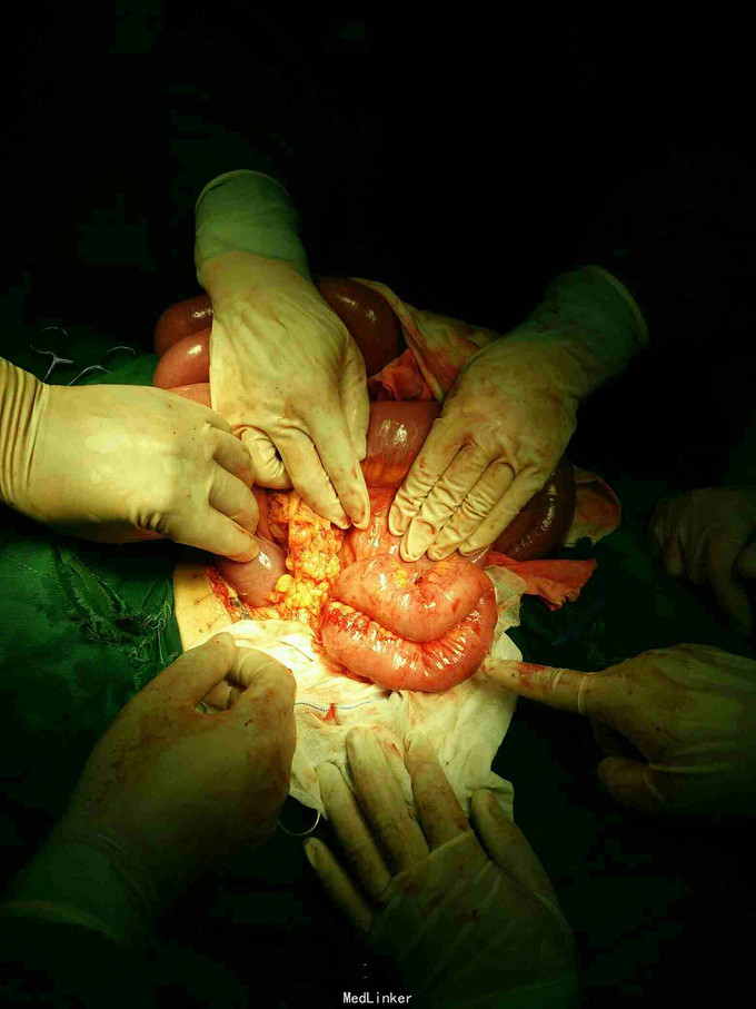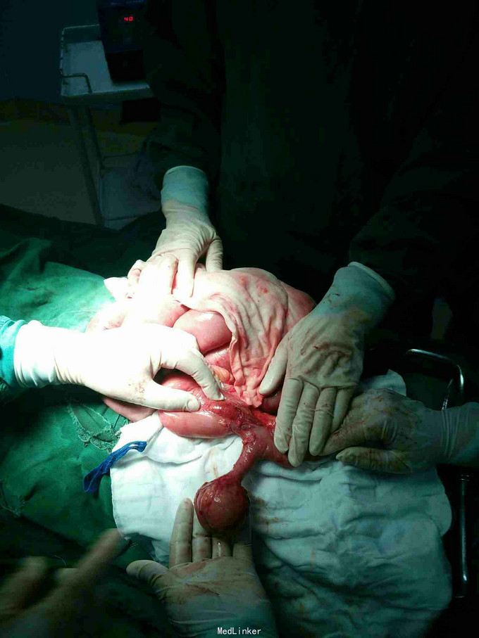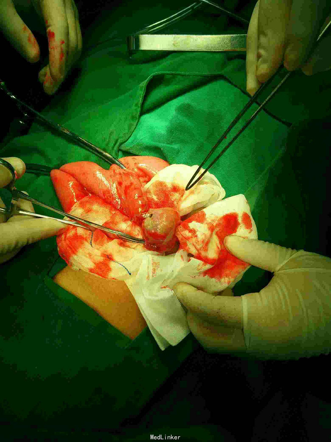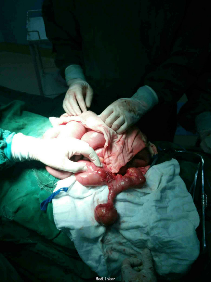 男,25岁,转移性右下腹痛6小时,右下腹中下腹压痛反跳痛明显,未触及包块,B超、X线片未见异常,白细胞2.1,中性粒87%,取右侧经腹直肌探査切口,距离回盲部30CM处发现,如前四张图片;男22岁,腹部刀刺伤于外院手术探查后转入我院,术后肠梗阻症状明显,保守治疗后未见好转,再次入腹,广泛肠粘连,回盲部尤为明显,整体成饼状,分离粘连后见距离回盲部40cm处发现。