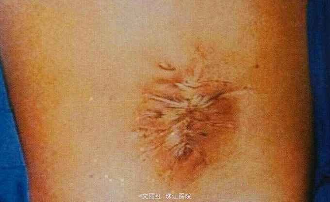 脐部周围局部瘢痕凹凸不平,脐形态消失。