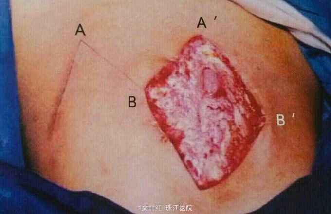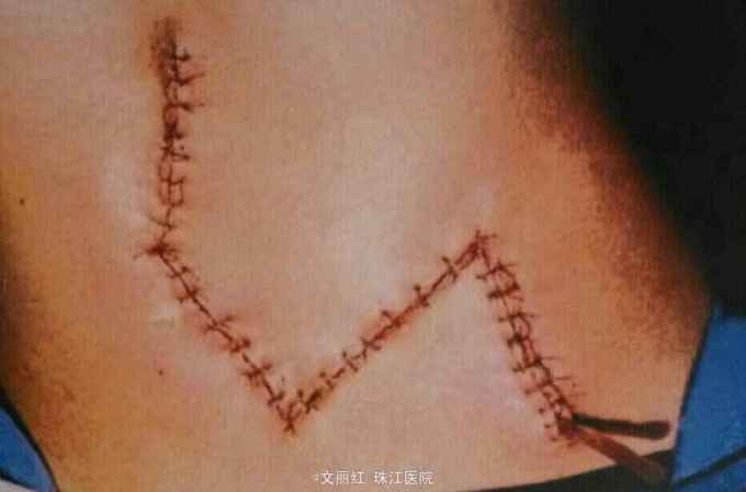 菱形皮瓣是利用缺损临近处的皮肤,采取旋转和推进相结合的方式直接覆盖缺损区,是一种异位皮瓣,可用于身体各部位,面颌外侧缘等效果也很好。本病例瘢痕面积大,使用菱形皮瓣效果也很好。