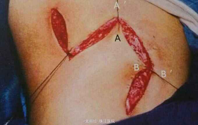 诊断:脐部瘢痕 治疗:设计菱形皮瓣,切除瘢痕组织,形成皮瓣并将其转移至创面。皮瓣下放置引流管,切口分层缝合。
