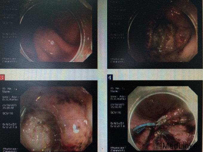 患者,女,59岁 主诉:发现胃粘膜下肿瘤2年余 现病史:患者于2013-09-24日因胃底高级别上皮内瘤变、食管乳头状瘤、胃底粘膜下肿瘤在我院行ESD。术后恢复好。于2013-10-17复查超声内镜示:胃底粘膜下低回声占位(间质瘤可能大),于2013-12-13日复查胃镜示胃粘膜下肿瘤。2014-01-02于我院行ESD,手术过程出现血压波动较大,遂停止操作。2014-10-17日再次于我科拟行胃ESD术中因血压波动大中断手术。2015-09-19我院门诊复查内镜示:胃ESD术后,胃粘膜下隆起,糜烂性胃炎。活检:(胃窦)送检粘膜组织表面糜烂慢性炎,少量腺上皮低级别内瘤变,间质充血,散在炎细胞浸润,HP(+)。2015-09-19日于外院查上腹部增强CT示:胃底部间质瘤。 既往史:“高血压病”病史20余年,最高180/100mmHg,自服缬沙坦、倍他乐克降压治疗,平素血压控制可;糖尿病史15年,自服格列美脲片、二甲双胍降糖治疗,自诉血糖控制良好。17岁时因卵巢囊肿行囊肿切除术,2013-09-24在我院行ESD术,“青霉素”过敏史。