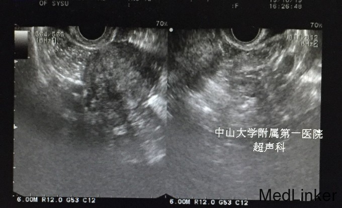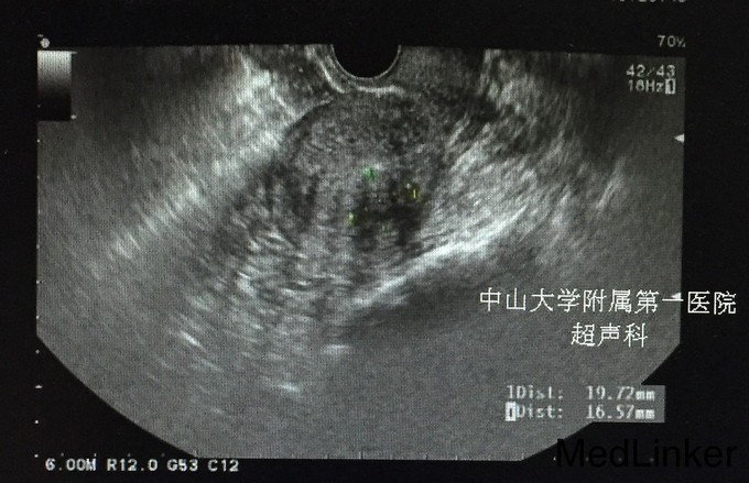查体:;宫颈轻度糜烂,余未见异常。 辅查:.2015-10-04妇科B超:子宫增大,子宫肌瘤(后壁2.2cm*2.1cm),子宫内膜增厚,约1.8cm。 2015-10-10诊刮病理示:慢性子宫内膜炎,局部符合子宫内膜息肉,分泌期子宫内膜。 2015-10-25我院妇科B超:小型子宫肌瘤。(见图)