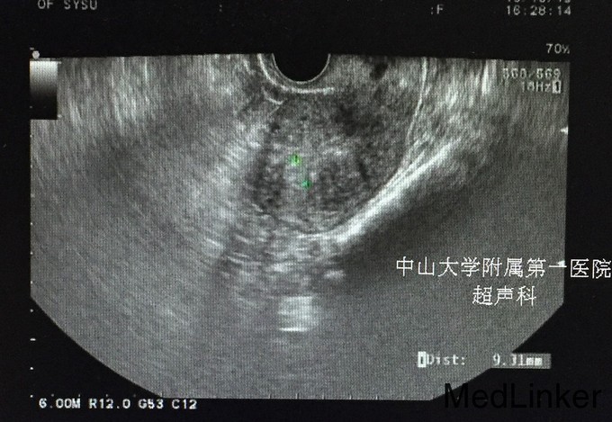 随访:内膜病理未见异常。术后两周,待随诊观察阴道出血及月经量情况。 讨论:患者46岁,围绝经期,有阴道不规则出血,应警惕子宫内膜病变可能,但患者曾行诊刮,病理未见异常,可暂予排除。尚需与粘连下子宫肌瘤 相鉴别,B超提示小型子宫肌瘤位于肌壁间,可排除。对于异常子宫出血伴出血量增多的患者,可行宫腔镜检查排除子宫内膜病变之后,行子宫内膜消融术,破坏部分子宫内膜,减少月经量,改善贫血。
