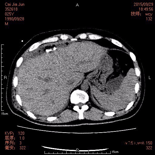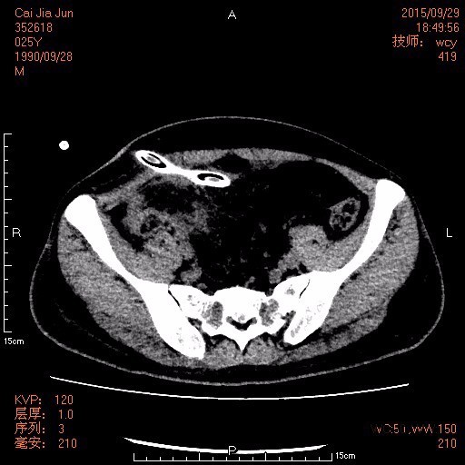 25岁男性患者,因阑尾穿孔引流术后10天收住入院。2周前无明显诱因出现右下腹痛,伴发热、恶心、呕吐,最高体温达39℃,在当地医院行抗感染、补液等处理后无明显好转,于2015-09-17在全麻下行腹腔镜下阑尾周围脓肿及盆腔脓肿引流置管术。2015-09-26行介入置管引流术,引流出大量灰黄色脓液伴恶臭。遂自行出院来我院就诊。