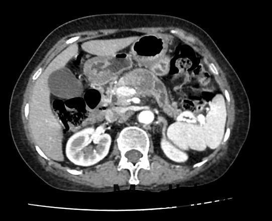 患者女,72岁,主因“消瘦半年,查体发现胰腺肿物1月”入院;患者半年前开始无明显诱因出现消瘦,体重逐渐减轻,约有3Kg。肿瘤标志物检查:癌胚抗原和CA-199增高。腹部CT平扫和腹部CT增强检查示:胰腺颈部肿瘤性病变,考虑胰腺癌可能性大。现为进一步诊治收入我科。