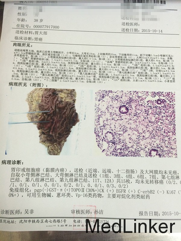 患者术后病理提示胃癌浸及粘膜下层,可以算作早期胃癌,但是,患者年轻,病理类型提示印戒细胞癌,术前不能准确判断肿瘤浸润深度,根据患者的病理类型,我们采用了d2+的术式,术后准备进行化疗。目前,早期胃癌,手术越做越小,有的采用d1术式,有的经内镜切除,但是我们相对保守,尽我们外科最大努力减少患者的复发。