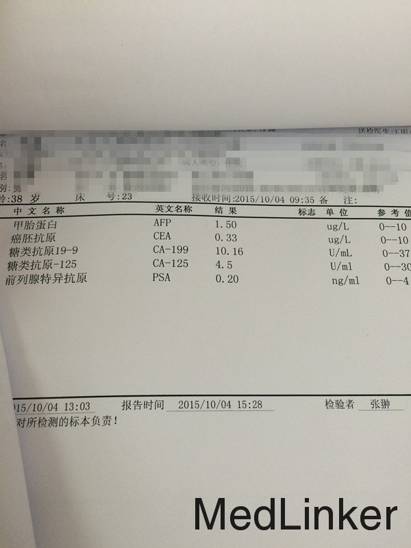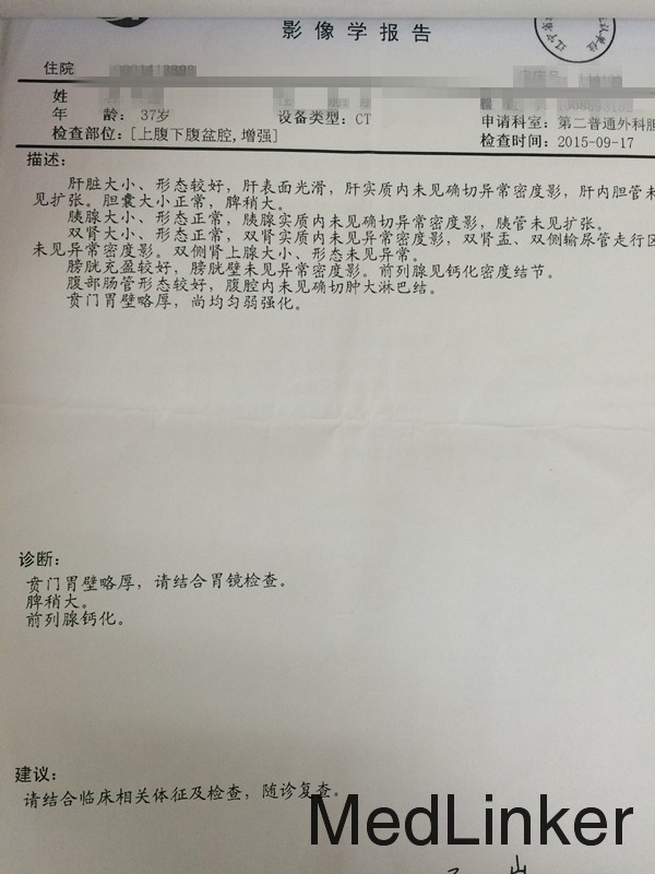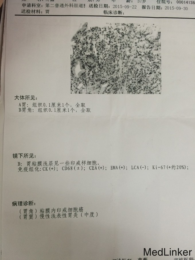 体温36℃,脉搏78次/分,呼吸18次/分,血压112/70mmHg,腹平坦,未见胃肠型及蠕动波,未见腹壁静脉曲张;全服软,全腹无压痛、无反跳痛及肌紧张,未触及腹部包块,肝脾肋下未触及,墨菲氏征阴性,肝脾区无叩击痛,肠鸣音4次/分 全腹CT:贲门胃壁略厚,请结合胃镜检查;脾稍大 胃镜:慢性浅表性胃炎;胃粘膜隆起糜烂待定 胃镜活检回报:印戒细胞癌