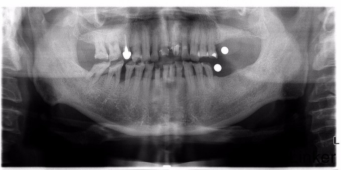 左侧上下均有缺牙,一直无法咀嚼,要求镶牙