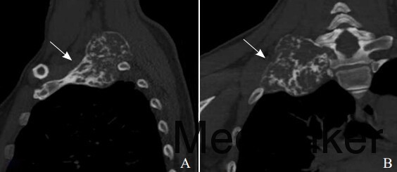 检查:右肩关节CT平扫后行多平面重建:右侧第1肋骨见骨质破坏侵犯T1椎体及横突,病灶呈膨胀性改变,大小约7cm x5cm,密度不均,内见不规则的条片状骨样密度影,骨皮质不连续处可见软组织密度影,周围肌肉软组织及右肺尖呈推压改变。