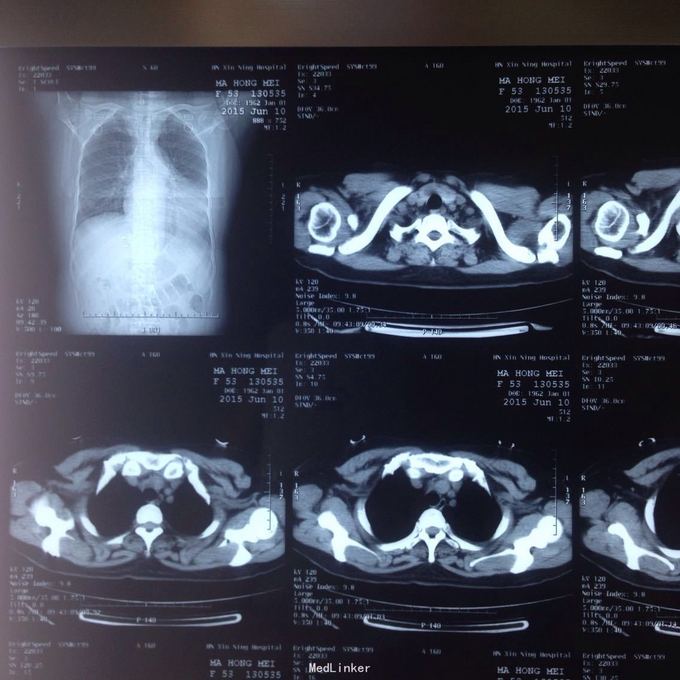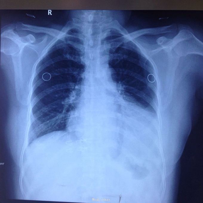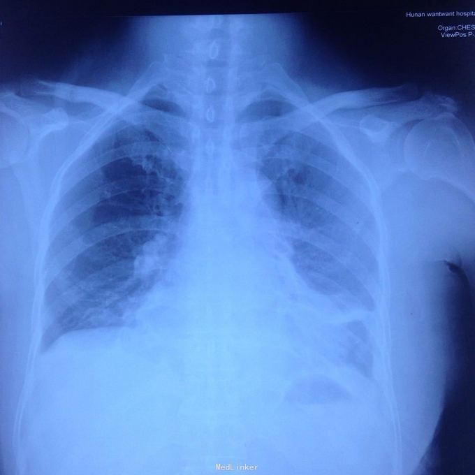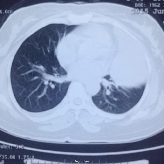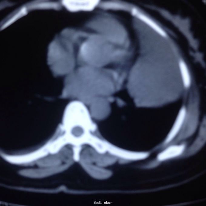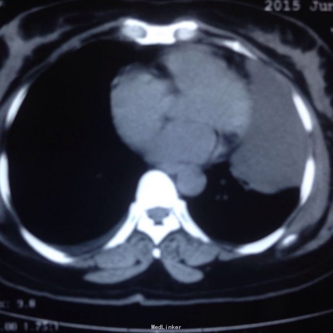 主诉:发现胸腔积液4月余。 现病史:患者4个月前因腰椎间盘突出在当地医院就诊,检查发现双侧少量胸腔积液,量不多,2个月后胸闷气短再次在当地医院复查胸部ct,提示双侧胸腔积液较前增多,左侧明显。