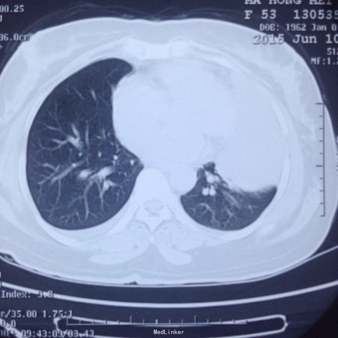 查体:女性患者,45岁,体温正常,一般情况可,颈软,气管居中。左下肺呼吸音稍低,右肺呼吸音清,未闻及干湿性啰音。心率80次/分,律齐,无杂音。