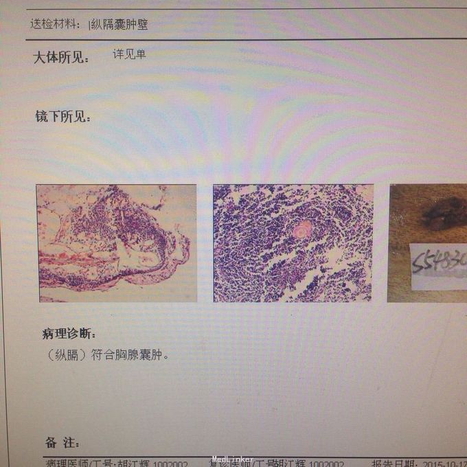 术后病检为胸腺囊肿。术后讨论:患者多次胸部ct均提示为包裹性积液,因囊肿较大,囊壁较薄,且靠近胸壁,易误诊为包裹性积液,但患者一直无发热病史,且复查ct积液位置靠胸前壁,术前应该考虑到囊肿可能,因患者经济较困难,至本院后未行增强ct,穿刺后考虑穿刺针将囊壁穿破,故开胸后未见完整囊肿,此类看似简单的病例容易由其他医院诊断误导,并且容易误诊。