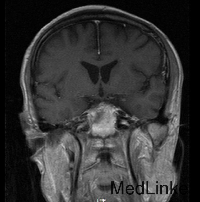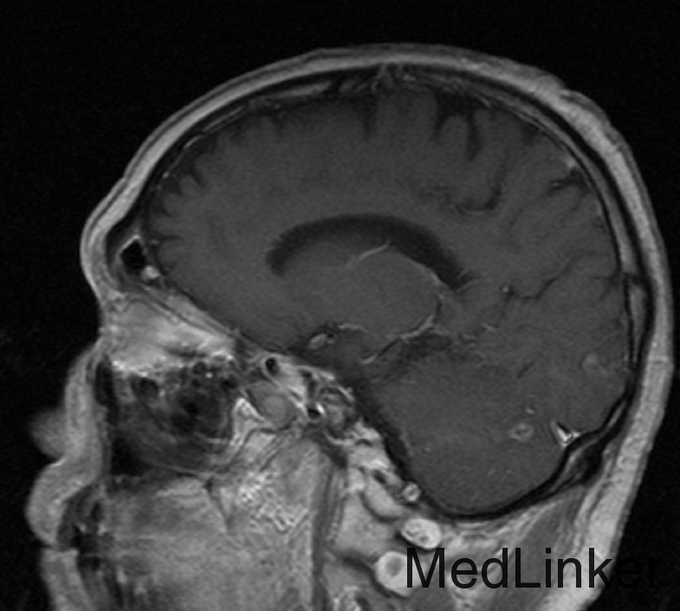 患者,男,56岁,因“右肺腺癌术后3年半余,头痛半年”入院。患者3.5年余前因肺癌在当地医院行手术治疗,术后予化疗8次,放疗32次,2年余前复查胸部CT见两肺转移。6月前患者出现头痛,不剧可忍,无视力模糊。