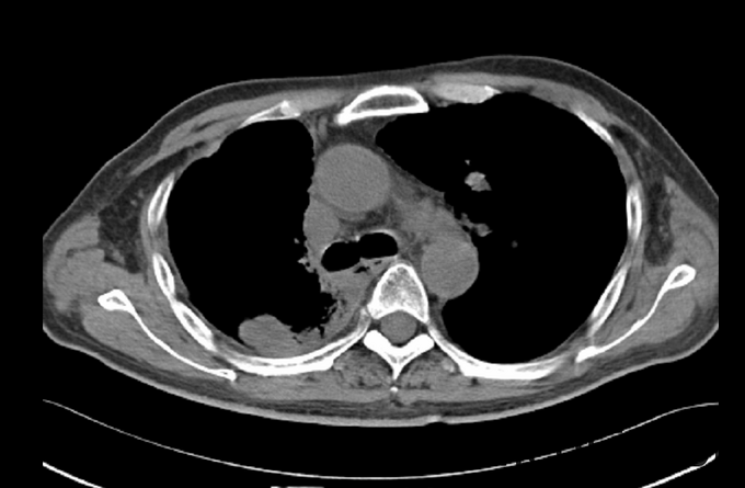 出院情况:患者无咳嗽咳痰、无发热,无头痛不适。查体:神清,精神可,生命体征平稳,双侧瞳孔等大等圆,直径约3mm,对光反射灵敏,动眼自主,额纹对称,嘴角伸舌无歪斜。颈软,心肺听诊无殊,右侧侧胸部可见长约12cm手术疤痕,愈合可,腹平软,肝脾肋下未及,四肢感觉对称,活动自主,肌力5级,肌张力不高,病理征阴性。