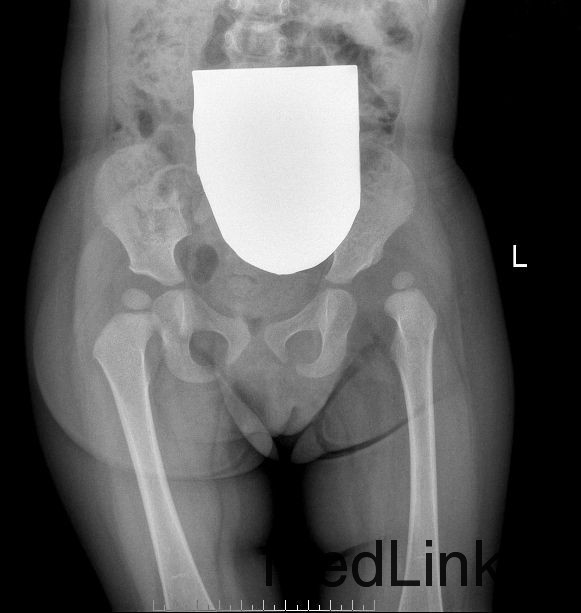 专科检查:抱入病房,行走跛行步态。双侧大腿皮纹不对称,左侧皮纹位置稍高。左下肢轻度外旋,左髋、膝关节轻度屈曲,左髋部无明显肿胀,无压痛、叩击痛,左髋关节外展稍受限,主动伸屈活动尚可,左大转子较对侧上移,Aills征(+),左下肢较对侧短缩约0.6cm,左下肢皮肤感觉正常,末梢血液循环好,各足趾活动良好。 骨盆正位片 :左侧发育性髋关节脱位:左侧髋臼角增大,左侧股骨头向外上移位,骨骺发育较对侧小,股骨头骨骺位于Perkins方格外上象限,Shenton氏线欠连续。髋臼指数:左侧37°,右侧23°。