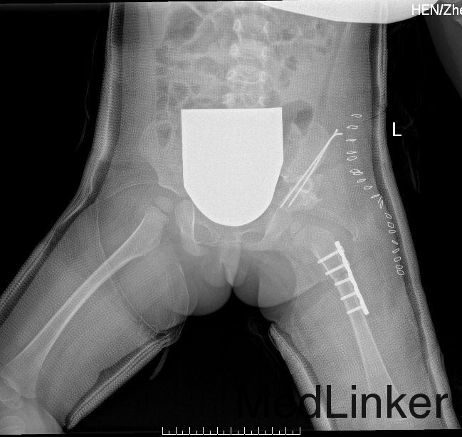 西医诊断:左侧发育性髋关节脱位 治疗:全麻下行“左髋切复、股内收肌松解、Salter骨盆截骨、股骨上段旋转截骨内固定并植骨术”