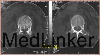 查体:卧床状态,腰部活动不能,行走不能,腰2棘突上叩痛,压痛(+)。双下肢大腿中段以下皮肤感觉减退、肌力正常,膝反射及膝踝反射正常,双侧Babinski征(-)。 辅助检查:CT检查示腰2椎体爆裂性骨折。椎管内占位改变。