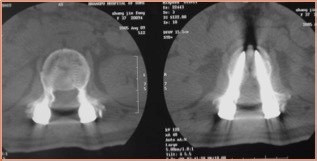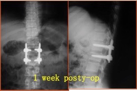 诊断:腰2椎体爆裂性骨折(AO分型:A3.1) 治疗:给予急诊行腰1-腰2椎弓根钉固定+骨折复位术。术中行椎板切除减压,用骨冲将突入椎管的骨块复位。