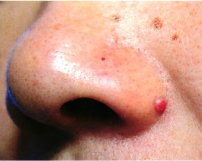 患者男,37岁。因左侧鼻翼起丘疹10年就诊。