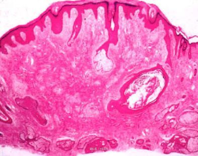 皮肤科检查:左侧鼻翼见一暗红色圆顶丘疹,直径约3 mm.表面光滑.中央轻度毛细血管扩张,质地中等,边界清楚,基底部皮肤正常。手术切除丘疹后行组织病理检查:病变呈外生性,角化过度,棘层增厚,真皮内胶原纤维增生.排列成巢状,其间可见增生、扩张的薄壁血管,并见散在的星状细胞。