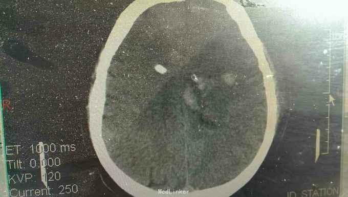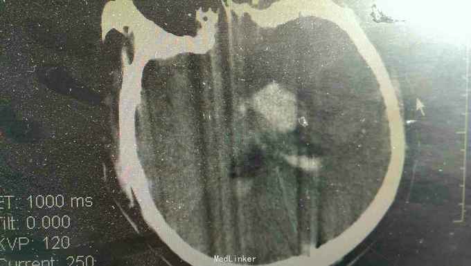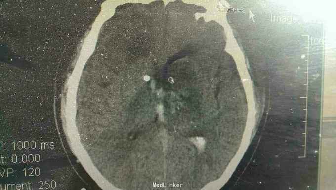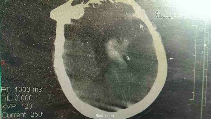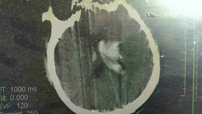 浅昏迷状态,无语言。刺激后右侧肢体不动,左侧肢体可动。双侧瞳孔等大正圆,直径3.0毫米,光反射迟钝。右侧病理反射阳性。