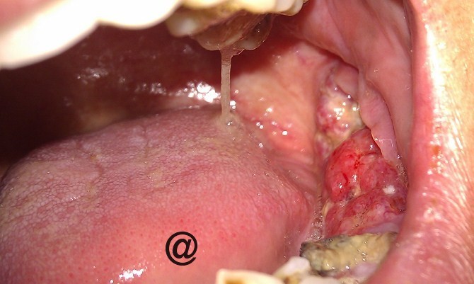 男性,45岁。左侧牙龈疼痛出血1月余 该患 1月前无明显诱因出现左侧牙龈疼痛,伴磨牙松动;自行在个体门诊输液治疗疗效欠佳;今日到我科门诊行活检术,病检结果为'高分化鳞癌';故我科以该病收入住院。